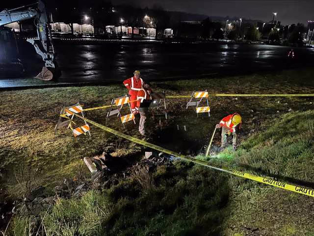 Emergency repairs were completed late Thursday, Dec. 11, 2025 on a small sinkhole discovered during routine flood patrols of the Green River levee system in Tukwila South, according to the City of Tukwila.