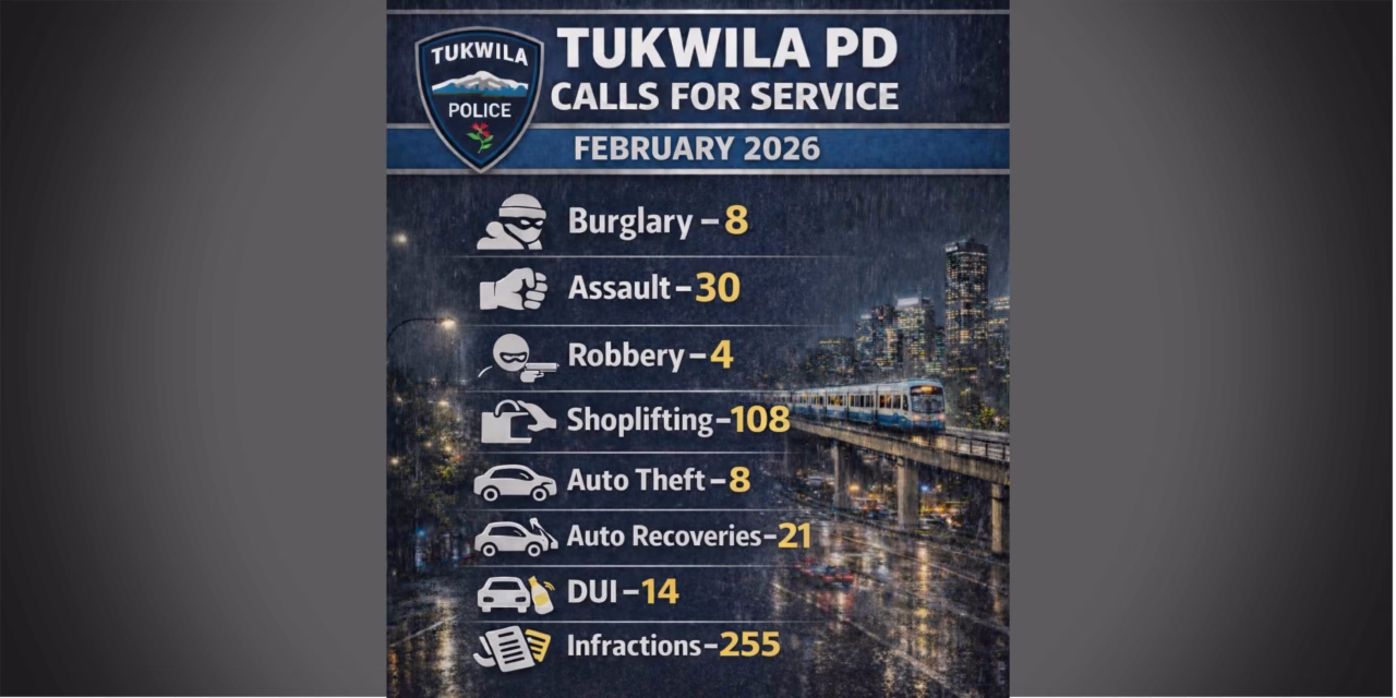 The Tukwila Police Department reported a sharp drop in auto thefts but notable increases in DUI arrests and traffic related infractions during February 2026 compared with the same month last year.